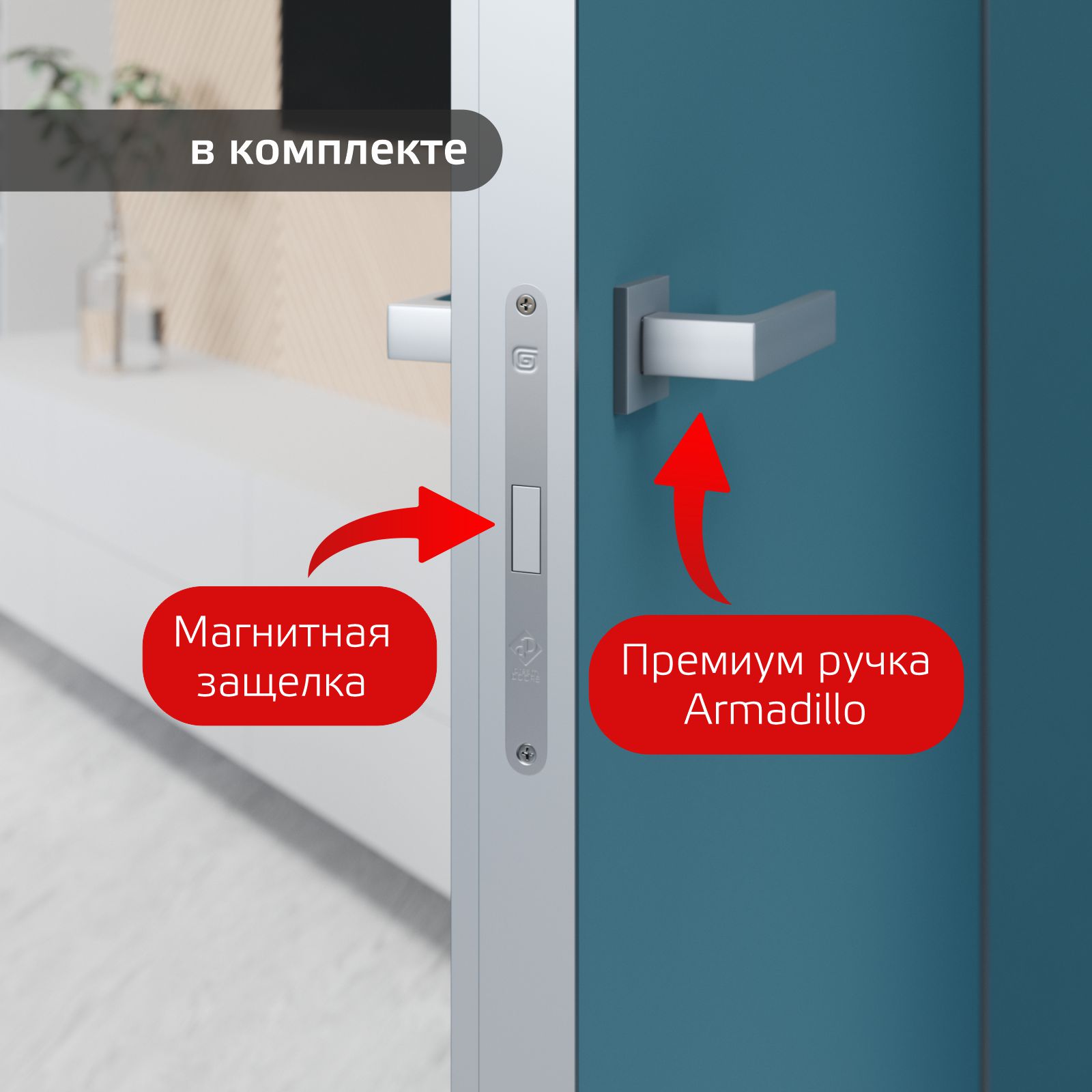 В комплект входит магнитная защелка ГАРДИАН SOFT и ручка ARMADILLO (цвет и форма на выбор).